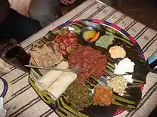 Niter kibbeh, or niter qibe (Amharic: ንጥር ቅቤ niṭer ḳibē), also called tesmi (in Tigrinya), is a seasoned, clarified butter used in Ethiopian and Eritrean cuisine. Its preparation is similar to that of ghee, but niter kibbeh is simmered with spices such as besobela (known as Ethiopian sacred basil), koseret,[1][2] fenugreek, cumin, coriander, turmeric, Ethiopian cardamom (korarima),[3] cinnamon, or nutmeg before straining, imparting a distinct, spicy aroma. The version using vegetable oil instead of butter is called yeqimem zeyet.[4]