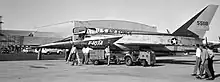 In June 1953, North American initiated an in-house study of advanced F-100 designs, leading to proposed interceptor (NAA 211: F-100BI denoting "interceptor") and fighter-bomber (NAA 212: F-100B) variants.[1] Concentrating on the F-100B, the preliminary engineering and design work focused on a tactical fighter-bomber configuration, featuring a recessed weapons bay under the fuselage and provision for six hardpoints underneath the wings. Single-point refueling capability was provided while a retractable tailskid was installed.[2] An all-moving vertical fin and an automated flight control system were incorporated which permitted the aircraft to roll at supersonic speeds using spoilers.[3] The flight control system was upgraded by the addition of pitch and yaw dampers.[2]
