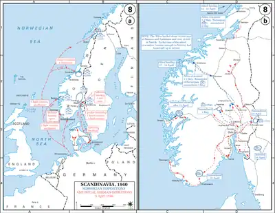 Controlling Norway would also be a strategic asset in the Battle of the Atlantic. The capture of ports would create gaps in the blockade of Germany, giving access to the Atlantic Ocean.[1] These ports would allow Germany to use its sea power effectively against the Allies.[7] Control of Norwegian air bases would allow German reconnaissance aircraft to operate far into the North Atlantic, while German U-boats and surface ships operating out of Norwegian naval bases would be able to break the British blockade line across the North Sea and attack convoys heading to Great Britain.[2][8]
