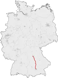 The Munich–Ingolstadt railway was opened in 1867 and extended to Treuchtlingen in 1870. Between 1870 and 1906 long-distance trains between Munich and Nuremberg used this line, with a total length of 198 kilometres.[14] With the commissioning of the Donauwörth–Treuchtlingen railway, the line between Nuremberg and Augsburg was reduced to 137 kilometres in 1906, and between Nuremberg and Munich to 199 km. After this shortening, Augsburg was again served by north-south traffic.[14]