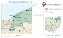 The 14th congressional district of Ohio is in the far northeast corner of the state, bordering Lake Erie and Pennsylvania. It is currently represented in the United States House of Representatives by Republican Dave Joyce.