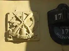 The sign of Osoaviakhim on the facade of house 17 on Polozov street in Saint Petersburg.