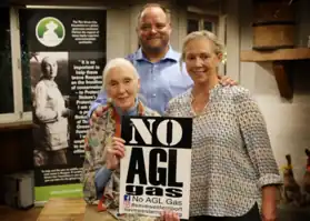 Ocean Elder Jane Goodall (left) protesting AGL gas, likely to protect Western Port Bay