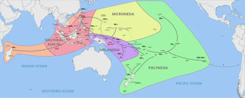 The Polynesian people are considered to be by linguistic, archaeological and human genetic ancestry a subset of the sea-migrating Austronesian people and tracing Polynesian languages places their prehistoric origins in the Malay Archipelago, and ultimately, in Taiwan. Between c. 3000 and 1000 BCE, speakers of Austronesian languages began spreading from Taiwan into Island Southeast Asia,[200][201][202] as tribes whose natives were thought to have arrived through South China c. 8,000 years ago to the edges of western Micronesia and on into Melanesia.