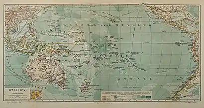 French writer Gustave d'Eichthal remarked in 1844 that, "the boundaries of Oceania are in reality those of the great ocean itself."[75] Conrad Malte-Brun in 1824 defined Oceania as covering Australia, New Zealand, the islands of Polynesia (which then included all the Pacific islands) and the Malay Archipelago.[76][77] American lexicographer Joseph Emerson Worcester wrote in 1840 that Oceania is "a term applied to a vast number of islands which are widely dispersed in the Pacific Ocean […] they are considered as forming a fifth grand division of the world." He also viewed Oceania as covering Australia, New Zealand, the Malay Archipelago and the islands of Melanesia, Micronesia, and Polynesia.[78] In 1887, the Royal Asiatic Society of Great Britain and Ireland referred to Australia as the area's westernmost land,[79] while in 1870, British Reverend Alexander Mackay identified the Bonin Islands as its northernmost point, and Macquarie Island as its southernmost point.[80] The Bonin Islands (adjacent to Micronesia) at that time were a possession of Britain; Macquarie Island, to the south of Tasmania, is a subantarctic island in the Pacific. It was politically associated with Australia and Tasmania by 1870.[81]