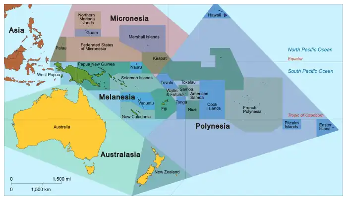 In a 1972 article for the Music Educators Journal titled Musics of Oceania, author Raymond F. Kennedy wrote, "many meanings have been given to the word Oceania. The most inclusive–but not always the most useful–embraces about 25,000 land areas between Asia and the Americas. A more popular and practical definition excludes Indonesia, East Malaysia (Borneo), the Philippines, Taiwan, Japan and other islands closely related to the Asian mainland, as well as the Aleutians and the small island groups situated near the Americas. Thus, Oceania most commonly refers to the land areas of the South and Central Pacific."[101] Kennedy defined Oceania as including Australasia, Melanesia, Micronesia, and Polynesia.[101] The U.S. Government Publishing Office's Area Handbook for Oceania from 1971 states that Australia and New Zealand are the principal large sovereignties of the area. It further states, "In its broadest definition Oceania embraces all islands and island groups of the Pacific Ocean that lie between Asia and the two American continents. In popular usage, however, the designation has a more restricted application. The islands of the North Pacific, such as the Aleutians and the Kuriles, usually are excluded. In addition, the series of sovereign island nations fringing Asia (Japan, Taiwan, the Philippines, East Malaysia, the Republic of Indonesia) are not ordinarily considered to be part of the area."[102] In 1948, American military journal Armed Forces Talk broke the islands of the Pacific up into five major subdivisions; Indonesia, Melanesia, Micronesia, Polynesia and the non-tropical Islands. The Indonesia subdivision consisted of the islands of the Malay Archipelago, while the non-tropical islands were categorized as being North Pacific islands such as Alaska's Kodiak archipelago, the Aleutian Islands, Japan, the Kuril Islands and Sakhalin. Japan's Bonin and Ryukyu Islands are also considered to be subtropical islands, with the main Japanese archipelago being non-tropical.[103] The journal associated the term Oceania with the Melanesian, Micronesian and Polynesian subdivisions, but not with the Indonesian or non-tropical subdivisions.[104] The Pacific Islands Handbook (1945), by Robert William Robson, stated that, "Pacific Islands generally are regarded as Pacific islands lying within the tropics. There are a considerable number of Pacific Islands outside the tropics. Most of them have little economic or political importance." He noted the political significance of the Aleutian Islands, which were invaded by the Japanese military in World War II, and categorized New Zealand's Antipodes Islands, Auckland Islands, Bounty Islands, Campbell Islands, Chatham Island and Kermadec Islands as being non-tropical islands of the South Pacific, along with Australia's Lord Howe Island and Norfolk Island. The Kermadec Islands, Lord Howe Island and Norfolk Island are also considered to be subtropical islands. Other non-tropical areas below the equator, such as Chiloé Island, Macquarie Island, Tasmania, and the southern portions of mainland Australia and New Zealand, were not included in this category.[105]