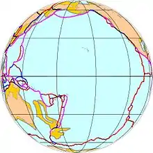 The Pacific Plate, which makes up most of Oceania, is an oceanic tectonic plate that lies beneath the Pacific Ocean. At 103 million square kilometres (40,000,000 sq mi), it is the largest tectonic plate. The plate contains an interior hot spot forming the Hawaiian Islands.[238] It is almost entirely oceanic crust.[239] The oldest member disappearing by way of the plate tectonics cycle is early-Cretaceous (145 to 137 million years ago).[240]