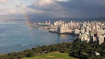 The attack on Pearl Harbor by the Japanese Imperial General Headquarters,[222][223] was a surprise military strike conducted by the Imperial Japanese Navy against the United States naval base at Pearl Harbor, Hawaii, on the morning of 7 December 1941. The attack led to the United States' entry into World War II. The Japanese subsequently invaded New Guinea, Solomon Islands and other Pacific islands. The Japanese were turned back at the Battle of the Coral Sea and the Kokoda Track campaign before they were finally defeated in 1945. Some of the most prominent Oceanic battlegrounds were the Battle of Bita Paka, the Solomon Islands campaign, the Air raids on Darwin, the Kokada Track, and the Borneo campaign.[224][225] The United States fought the Battle of Guam from 21 July to 10 August 1944, to recapture the island from Japanese military occupation.[226]