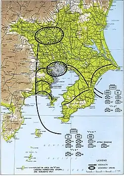 Operation Coronet, the invasion of Honshu at the Kantō Plain south of the capital, was to begin on "Y-Day", which was tentatively scheduled for 1 March 1946.[19] Coronet would have been even larger than Olympic, with up to 45 U.S. divisions assigned for both the initial landing and follow-up[20] (The Overlord invasion of Normandy, by comparison, deployed 12 divisions in the initial landings.). In the initial stage, the First Army would have invaded at Kujūkuri Beach, on the Bōsō Peninsula, while the Eighth Army invaded at Hiratsuka, on Sagami Bay; these armies would have comprised 25 divisions between them.[21] Later, a follow-up force of up to 20 additional U.S. divisions and up to 5 or more British Commonwealth divisions would have landed as reinforcements.[22][23] The Allied forces would then have driven north and inland, encircling Tokyo and pressing on toward Nagano.