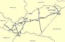 During the Civil War, the towns of Orange and Gordonsville continued as important railroad hubs and hospital centers for the Confederacy. Confederate military companies recruited from the county included three companies of the 13th Virginia Infantry, the Gordonsville Grays, two artillery companies, one cavalry company (the Orange Rangers), and many soldiers in the 7th Virginia Infantry, Wise Artillery and 6th Virginia Cavalry. General Robert E. Lee often rode through the county and wintered the Army of Northern Virginia in Orange County during 1863–64, the Rapidan River becoming a defensive line.[10] Cavalry raids against the railroad supply lines occurred, including several at Rapidan on the border with Culpeper County. Troops often crossed the Rapidan River at Germanna Ford near Locust Grove. After Fredericksburg fell to Union forces, Mosby's Rangers were formed and conducted some operations (as well as recovered from wounds) in Orange County; Mosby himself was once captured while waiting for a train in Beaverdam in Hanover County for travel through Orange County. The 1863 Battle of Mine Run and the 1864 Battle of the Wilderness both occurred in eastern Orange County, as Union troops drove toward the Confederacy's capital. The latter became a significant turning point in the war.