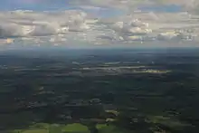 The airport is located 19 nautical miles (35 km; 22 mi) northeast of Oslo, at Gardermoen at the border of municipalities Nannestad and Ullensaker, in Viken county.[4] It has two parallel roughly north–south runways measuring 3,600 metres (11,811 ft) and 2,950 metres (9,678 ft) and 71 aircraft stands, of which 50 have jet bridges. The airport is connected to the city center by the high-speed railway Gardermoen Line served by mainline trains and Flytoget. The percentage of passengers using public transport to get to and from the airport is one of the highest in the world at nearly 70%.[5] The ground facilities are owned by Oslo Lufthavn AS, a subsidiary of the state-owned Avinor. Also at the premises is Gardermoen Air Station, operated by the Royal Norwegian Air Force. An expansion with a new terminal building and a third pier opened in late April 2017.[6][7]