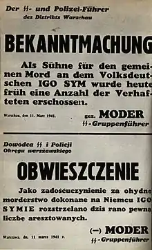 On 7 March 1941, actor Igo Sym, well-known Nazi collaborator and Gestapo agent, was assassinated by the soldiers of the Union of Armed Struggle. In retaliation, 21 Pawiak prisoners were executed in Palmiry four days later. Among the victims were Stefan Kopeć (biologist, professor at the University of Warsaw) and Kazimierz Zakrzewski (historian, professor at the University of Warsaw).[45][46]