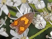 Pammene aurana has a wingspan of 9–13 mm.[4] These moths show chocolate brown or reddish brown forewings with yellow-orange blotches. They usually have two almost round yellow-orange spots before the wing's outer edge and a large round or semicircular yellow-orange marking in the middle at the wing's rear edge. The fringes are dark brown. The hind wings are dark. Head, thorax, abdomen and antennae are brown to dark brown. In the form Pammene aurana var. aurantiana the various yellow-orange markings flow together and only the wing base, the costa and the outer edge are brown.