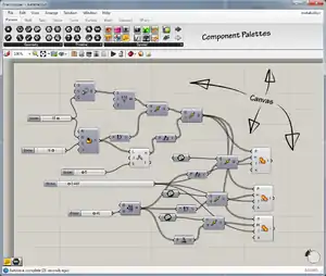| Grasshopper 3D | A plug-in for Rhinoceros 3D that provides a visual programming language interface to create and edit geometry. It is based on graphs that map the flow of relations from parameters through user-defined functions (nodes). | ![]() |