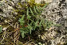 Pellaea atropurpurea grows in the crevices of dry limestone cliffs, rocky slopes, crevices in alvars,[2] and mortared walls. It is endangered in Florida, Iowa, and Rhode Island. It has become extinct in Louisiana since the limestone caprock of a salt dome at Winfield, the only location for the fern in the state, was quarried away.[3]