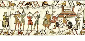 When William the Conqueror launched his invasion of England by landing at Pevensey Bay on 28 September 1066, his army sheltered for the night in a temporary fortification situated within the old Roman fort. The Normans dug a ditch across the causeway linking the fort with the mainland and made repairs to the Roman walls to strengthen them. The army left for Hastings the following day, en route to the Battle of Hastings.[47] The Bayeux Tapestry depicts William's army constructing a castle at "Hestengaceastra", a Latinised rendition of the Saxon placename Haestingaceaster. As placenames with the suffix—ceastre were almost always associated with Roman forts (compare Manchester, Lancaster, Doncaster etc.) and no Roman fort is known to have existed at the modern site of Hastings, it has been suggested that the name actually refers to Anderitum—in which case the depiction in the Tapestry may show the construction of the temporary Norman castle within the Roman fortress walls.[48]