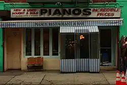 Pianos follows the example of Arlene's Grocery by keeping the "Pianos" name and sign from the store that previously existed there when it was conceivable that a piano store might make it on the Lower East Side. Pianos has two stages: one that has upstairs in a funky loungelike setting, and one in a back room off the main floor.[1]