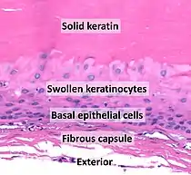 - ↑ Anne Elizabeth Laumann. "Which histologic findings are characteristic of trichilemmal cyst (pilar cyst)?". Medscape. Updated: Jun 11, 2020,