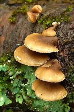 Gilled fungi with laterally-attached fruiting bodies are said to be pleurotoid (Gr.: pleurē + ōtos + -oid, literally "side-ear form" or "having the likeness of Pleurotus ssp."). Pleurotoid fungi are typically wood-decay fungi and are found on dead and dying trees and coarse woody debris. The pleurotoid form is polyphyletic, having evolved a number of times within the Basidiomycota.[1] Many species of pleurotoid fungi are commonly referred to as "oyster" mushrooms.[2] Laterally-attached fungi with pores rather than gills are referred to as bracket fungi.