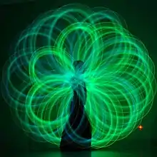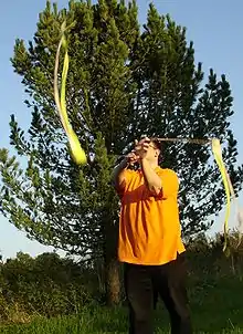 Māori poi come in two forms: short, with strings equal to the length of the fingertips to the wrist; and long, with strings equal to the distance from fingertips to shoulder.[4][5] A performance includes storytelling and singing in conjunction with choreographed poi routines and is often presented alongside other disciplines, such as waiata a ringa, haka and titi torea (included in kapa haka performances). Poi feature in the 1980s hit song "Poi E".[6]