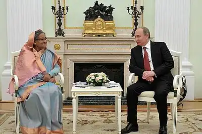 Bangladesh Awami League leader Sheikh Hasina's new cabinet took oath on 3 January 2019.[67][68] Despite refusing to sell gas (LPG) at a better deal to the US back in 2000, in October 2019 Sheikh Hasina in a contradictory statement controversially stated that she will sell LPG to India despite the scarcity of LPG in Bangladesh (BD). Hasina also stated she will give India free access to extract BD's Feni water, despite her failure to secure the Teesta river sharing deal.[69][70] The dispute between BD and Myanmar over the unresolved Rohingya Refugee Crisis continued during this period, with Myanmar's unwillingness to take back the refugees.[71] In October 2020 Myanmar deployed their army troops on the Bangladesh border. Bangladesh appealed to the UN Security Council to prevent any escalation. Later Prime Minister Sheikh Hasina assured "a safe zone must be created for the Rohingyas Refugees. If that is done, Myanmar will face a huge problem in the Rakhine region. I don't think Myanmar will lock in war with Bangladesh; China will not let that happen." No further escalations have been reported, BD and Myanmar have since remained in peace militarily, but the diplomatic dispute continues to be debated at the UN.[72][73][74]
