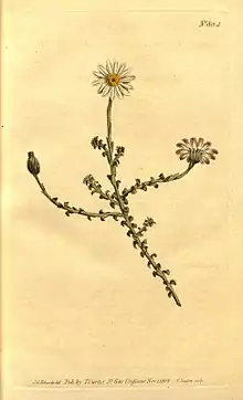 Polyarrhena is a genus of low, branching shrublets that is assigned to the daisy family (Compositae or Asteraceae). Its stems are alternately and densely set with entire or somewhat toothed leaves. Like in almost all Asteraceae, the individual flowers are 5-merous, small and clustered in typical heads, and which are surrounded by an involucre of in this case three whorls of bracts. In Polyarrhena, the centre of the head is taken by yellow disc florets, and is surrounded by one single whorl of white ligulate florets that have a pinkish-purple wash on the underside. These florets sit on a common base (or receptacle) and are not individually subtended by a bract (or palea). The species occur in the Cape Floristic Region. Polyarrhena reflexa has long been cultivated as an ornamental and is often known under its synonym Aster reflexum.[1]