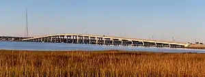 The Ponquogue Bridge is a 2,812-foot-long (857 m) bridge over Shinnecock Bay in the hamlet of Hampton Bays, New York (within the town of Southampton). Maintained by the Department of Works for Suffolk County, the 29-span bridge carries two lanes of County Route 32 over the bay, connecting Hampton Bays to the eastern end of Westhampton Island.[3] The bridge, which is made of concrete, has a 55-foot (17 m) vertical clearance above Shinnecock Bay. Constructed in 1986 at the cost of $14 million, the bridge replaced an older span over the bay, which was a 1,000-foot-long (300 m) wooden drawbridge built in 1930. The former Ponquogue Bridge currently serves as a fishing pier under the current span.