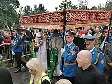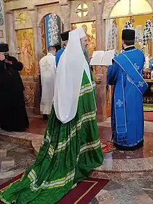 Porfirije was enthroned on 19 February 2021 in St. Michael's Cathedral in Belgrade.[47] Patriarchal insignias were handed over to him by Metropolitan Hrizostom of Dabar-Bosnia and Bishop Lukijan of Buda. In his introductory speech Porfirije focused on unity and peace building. He stated that Kosovo and Metohija is in his prayers, and the Serbs in the affected Kosovo and Metohija will be in his first place.[48] Also, he stated that Croatia has become his second homeland, and the people he met there will remain a role model for him in the years to come.[49] The inauguration was attended by numerous government ministers of Serbia, representatives of churches and religious communities in Serbia, and various politicians including Serbian President Aleksandar Vučić. The ceremony was also attended by Milorad Dodik, the chairman and the presiding Serb member of the Presidency of Bosnia and Herzegovina; Željka Cvijanović, the President of Republika Srpska (Serb-majority entity of Bosnia and Herzegovina); Apostolic Nuncio Luciano Suriani; Archbishop Stanislav Hočevar, the Catholic archbishop of Belgrade, Effendi Mustafa Jusufspahić, the Mufti of Serbia; and many other dignitaries such as Prince Filip Karađorđević, a member of the House of Karađorđević.[50][47] On 20 February, a day following the inauguration, a Holy Synod member and one of the three prime candidates for the new Patriarch election Bishop Irinej of Bačka tested positive for COVID-19.[51]