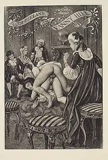 During the Victorian era (1837–1901) the invention of the rotary printing press made publication of books easier, many works of lascivious nature were published during this period often under pen names or anonymity.[55] In 1837 the Holywell Street (known as "Booksellers' Row") in London had more than 50 shops that sold pornographic material.[15] Many of the works published in the Victorian era are considered bold and graphic even by today's lenient standards.[56] The english novel The Adventures, Intrigues, and Amours, of a Lady's Maid! written by anonymous "Herself" (c. 1838) professed the notion that homosexual acts are more pleasurable for women than heterosexuality which is linked to painful and uncomfortable experiences.[57] Some of the popular publications from this era include: The Pearl (magazine of erotic tales and poems published from 1879 to 1881); Gamiani, or Two Nights of Excess (1870) by Alfred de Musset; and Venus in Furs (1870) by Leopold von Sacher-Masoch, from whose name the term "masochism" was derived.[55] The Sins of the Cities of the Plain (1881) is one of the first sole male homosexual literary work published in English, this work is said to have inspired another gay literary work Teleny, or The Reverse of the Medal (1893), whose authorship has often been attributed to Oscar Wilde.[56] The Romance of Lust, written anonymously and published in four volumes during 1873–1876, contained graphical descriptions of themes detailing incest, homosexuality, and orgies.[58] Other publications from the Victorian era that included fetish and taboo themes such as sadomasochism and 'cross-generational sex' are: My Secret Life (1888–1894) and Forbidden Fruit (1898). On accusations of obscenity many of these works had been outlawed until the 1960s.[58]
