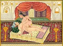 Kama, the word used to connote sexual desire, was explored in Indian literary works such as the Kama Sutra, which dealt with the practical as well as the psychological aspects of human courtship and sexual intercourse.[33][34] The Sanskrit text Kama sutra was compiled by the sage Vatsyayana into its final form sometime during the second half of the third century CE.[35] This text, which included prose, poetry, as well as illustrations regarding erotic love and sexual behaviour,[18] is one of the most celebrated Indian erotic works.[36]