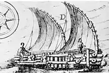 Pre-Columbian rafts were steered by a combination of adjusting the sails and the use of centerboards, called "guaras." These were boards typically about 60 centimetres (2.0 ft) wide inserted vertically into the sea between the balsa logs. On larger rafts there were three sets of the guaras at the front, back, and the middle of the raft. Raising, lowering, or removing some of the guaras or moving them toward the bow or stern reduced or increased sub-surface tension and made it possible to steer the raft. Working in tandem with the sails, the guaras, according to an 1820 report, permitted the crew to undertake "all the maneuvers of a regularly built and well-rigged [sailing] vessel."[12] The rafts could achieve a speed of 4 to 5 knots.[13]