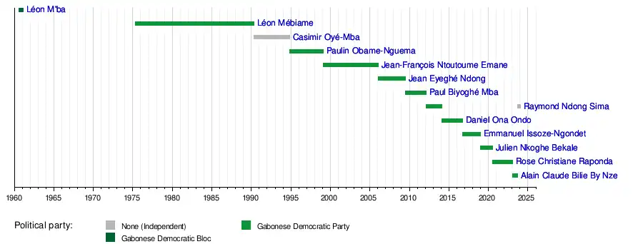 - ↑ From 1961 to 1981 the President of Gabon was both head of state and head of government, while the Prime Minister only assisted him in managing government affairs.