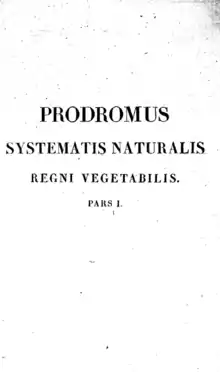 Prodromus Systematis Naturalis Regni Vegetabilis (1824–1873),[1] also known by its standard botanical abbreviation Prodr. (DC.), is a 17-volume treatise on botany initiated by Augustin Pyramus de Candolle. De Candolle intended it as a summary of all known seed plants, encompassing taxonomy, ecology, evolution and biogeography. He authored seven volumes between 1824 and 1839, but died in 1841. His son, Alphonse de Candolle, then took up the work, editing a further ten volumes, with contributions from a range of authors. Volume 17 was published in October 1873.[2] The fourth and final part of the index came out in 1874.[3] The Prodromus remained incomplete, dealing only with dicotyledons.