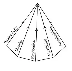 The relation between these five objects can be presented as a pyramid with its tip associated with the lowest Cost, highest Productivity, highest Quality, most Flexibility, and greatest Sustainability. The points inside of this pyramid are associated with different combinations of five criteria. The tip of the pyramid represents an ideal (but likely highly unfeasible) system whereas the base of the pyramid represents the worst system possible.