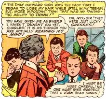 With help from his superhuman powers and natural genius, Xavier becomes an excellent student and athlete, though he gives up the latter, believing his powers give him an unfair advantage. Due to his powers, by the time he graduates from high school, Charles loses all of his hair. He enters Bard College at age 16 and graduates with his bachelor's degree in biology in only two years.[10] In graduate studies, he receives Ph.D.s in Genetics, Biophysics, Psychology, and Anthropology with a two-year residence at Pembroke College, University of Oxford.[11] He also receives an M.D. in Psychiatry while spending several years in London.[12][13] He is later appointed adjunct professor at Columbia University.[14] Origins of Marvel Comics: X-Men #1 (2010) presents a different version of events, suggesting a scholarship to the University of Oxford rescued him from his abusive home, after which he "never looked back", suggesting he began his academic career as a very young man at Oxford.[15] His stepbrother is resentful of him.