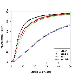 Computer scientist Ramesh Sitaraman has asserted that Internet users are impatient and are likely to get more impatient with time.[7] In a large-scale research study[4][8] that completed in 2012 involving millions of users watching videos on the Internet, Krishnan and Sitaraman show that users start to abandon online videos if they do not start playing within two seconds.[9] In addition, users with faster Internet connections (such as FTTH) showed less patience and abandoned videos at a faster rate than users with slower Internet connections. Many commentators have since argued that these results provide a glimpse into the future: as Internet services become faster and provide more instant gratification, people become less patient[5][6] and less able to delay gratification and work towards longer-term rewards.[10]