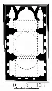 The temple is a domed single-nave basilica type completed in the 6th or 7th century. Presently, the only surviving parts of the temple are most of the north wall, part of the south wall with one of the four impost arches of the dome, and some traces of the vaulting. The cupola and ceiling vaults, drum, and dome have since collapsed.