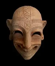 A range of grave goods are found deposited with the deceased, which seem to have been intended to provide the deceased with protection and symbolic nourishment.[58] These do not differ significantly based on the gender or age of the deceased.[59] Grave offerings could include carved masks[21] and amulets, especially the eye of Horus (wadjet) and small glass apotropaic heads (protomae), which were intended to protect the deceased.[60] Offerings of food and drink were probably intended to nourish the deceased in the afterlife.[20][33] They were often accompanied by a standardised set of feasting equipment for the deceased, consisting of two jugs, a drinking bowl, and an oil lamp.[44][61] Oil and perfume may have been intended to provide the deceased with heat and light.[62] Chickens and their eggs were particularly frequent offerings and may have represented the soul's resurrection or transition to the afterlife in Punic thought.[44][63] Razors, left next to the head of the deceased, may indicate that the corpse was shaved before burial or an expectation that priests would continue to shave in death as they had in life.[49][64] Bronze cymbals and bells found in some tombs may derive from songs and music played at the funeral of the deceased - perhaps intended to ward off evil spirits. Terracotta figurines of musicians are found in graves, and depictions of them were carved on funerary stelae and on razors deposited in the grave. Almost all these musicians are female, suggesting that women had a particular role in this part of the funeral; most play the drums, kithara, or aulos.[65][66]