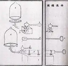 Air pump mechanisms became popular in Europe from around 1660 following the experiments of Boyle. In Japan, the first description of a vacuum pump appear in Aochi Rinsō (ja:青地林宗)’s 1825 Atmospheric Observations (気海観瀾, Kikai Kanran), and slightly later pressure pumps and void pumps appear in Udagawa Shinsai (宇田川榛斎(玄真))’s 1834 Appendix of Far-Western Medical and Notable Things and Thoughts (遠西医方名物考補遺, Ensei Ihō Meibutsu Kō Hoi). These mechanisms were used to demonstrate the necessity of air for animal life and combustion, typically by putting a lamp or a small dog in a vacuum, and were used to make calculations of pressure and air density.