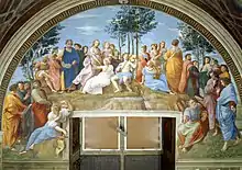 These very large and complex compositions have been regarded ever since as among the supreme works of the grand manner of the High Renaissance, and the "classic art" of the post-antique West. They give a highly idealised depiction of the forms represented, and the compositions, though very carefully conceived in drawings, achieve "sprezzatura", a term invented by his friend Castiglione, who defined it as "a certain nonchalance which conceals all artistry and makes whatever one says or does seem uncontrived and effortless ...".[43] According to Michael Levey, "Raphael gives his [figures] a superhuman clarity and grace in a universe of Euclidian certainties".[44] The painting is nearly all of the highest quality in the first two rooms, but the later compositions in the Stanze, especially those involving dramatic action, are not entirely as successful either in conception or their execution by the workshop.[45]