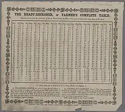 The term 'ready reckoner' was coined by the schoolmaster Daniel Fenning with the publication of The ready reckoner; or trader's most useful assistant in 1757.[6] This was a modernised and extended version of Leybourn's work, which was reprinted in Boston, Massachusetts, about 1770, and translated into German in Germantown, Philadelphia, 1774.[7] Fenning's work continued to be reprinted in England until the early 1820s when several of the tables were superseded by the advent Imperial Weights and Measures under the Weights and Measures Act 1824.