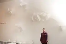 The Platonic Solids was inspired by Plato's conception of the five classical elements: earth, air, fire, water, and ether. In Plato's work Timaeus (c. 350 BCE), the five forms of matter are related to elemental solids and shapes (the cube, the octahedron, the -tetrahedron, the icosahedron, and the dodecahedron). In Kamen's work these regular polyhedra, created from fiberglass rods and sheets of mylar, are held against the larger plane of the wall, demonstrating "tension and compression".[15] The work appeared in 2011 as part of the exhibit Elemental Matters: Artists Imagine Chemistry, at the Chemical Heritage Foundation, Philadelphia, PA. It was accompanied by a sound component by bio-musician Susan Alexjander, Elements in Descending Order of Creation from Collapsing Stars. The exhibit also included Kamen's sculpture Hydrogen, Helium, Carbon, Nitrogen, Oxygen, Silicon, Phosphorus, Sulfur.[16]