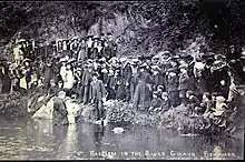 A scene from the 1904–1905 Welsh revival. Dan Davies of Hermon Chapel conducting a baptism in the River Gwaun in 1905.