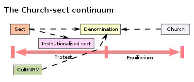 A diagram of the church-sect typology continuum including church, denomination, sect, cult, new religious movement, and institutionalized sect