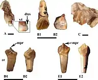Rhabdodontids have a simple dentition with leaf-shaped teeth used for a powerful scissors-like shearing. These teeth are well-suited to a diet hypothesised to have consisted of tough and fibrous plants such as Sabalites and Pandanites.[4] Each tooth has a ridge on it that is offset from the midline of the tooth. These ridges also have a specific pattern which is unique to Rhabdodontids: their dentary teeth have a central primary ridge with multiple equally spaced secondary ridges, and their maxillary teeth have no primary ridge and have similarly-sized secondary ridges.[1][3][4]