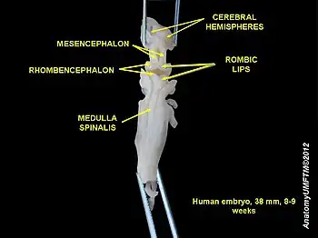 The rhombic lip is a posterior section of the developing metencephalon which can be recognized transiently within the vertebrate embryo. It extends posteriorly from the roof of the fourth ventricle to dorsal neuroepithelial cells.[1] The rhombic lip can be divided into eight structural units based on rhombomeres 1-8 (r1-r8), which can be recognized at early stages of hindbrain development.[2] Producing granule cells and five brainstem nuclei, the rhombic lip plays an important role in developing a complex cerebellar neural system.[3]