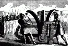 The scorpio was a crossbow-like device that shot smaller arrows with deadly accuracy[2] used both in the field and in sieges. They were so-named for their deadly, armor-piercing sting and could be operated by just one or two men. Scorpios were meant to kill and injure enemy troops, rather than break down enemy fortifications. Thanks to their smaller size, they could be mounted on or in siege towers. During the Siege of Amida, a scorpio arrow killed the son of Grumbates, king of the Chionitae, when he was approaching the city to surrender.[9]