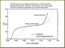 linear sweep voltammogram of 100 μM dopamine in phosphate buffered saline. Adapted from D. Sopchak, PhD thesis, Case Western Reserve University, 2001, figure 4.1
