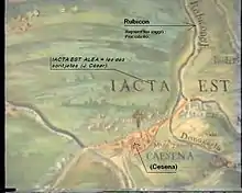 The Rubicon (Latin: Rubico; Italian: Rubicone [rubiˈkoːne];[1] Romagnol: Rubicôn [rubiˈkoːŋ]) is a shallow river in northeastern Italy, just south of Cesena and north of Rimini. It was known as Fiumicino until 1933, when it was identified with the ancient river Rubicon, famously crossed by Julius Caesar in 49 BCE.