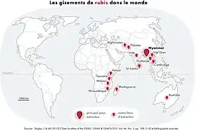 Spinel, another red gemstone, is sometimes found along with rubies in the same gem gravel or marble. Red spinels may be mistaken for rubies by those lacking experience with gems. However, the finest red spinels, now heavily sought, can have values approaching all but the finest examples of ruby.[12][13] The Mogok Valley in Upper Myanmar (Burma) was for centuries the world's main source for rubies. That region has produced some exceptional rubies; however, in recent years few good rubies have been found. In central Myanmar, the area of Mong Hsu began producing rubies during the 1990s and rapidly became the world's main ruby mining area. The most recently found ruby deposit in Myanmar is in Namya (Namyazeik) located in the northern state of Kachin.[14]